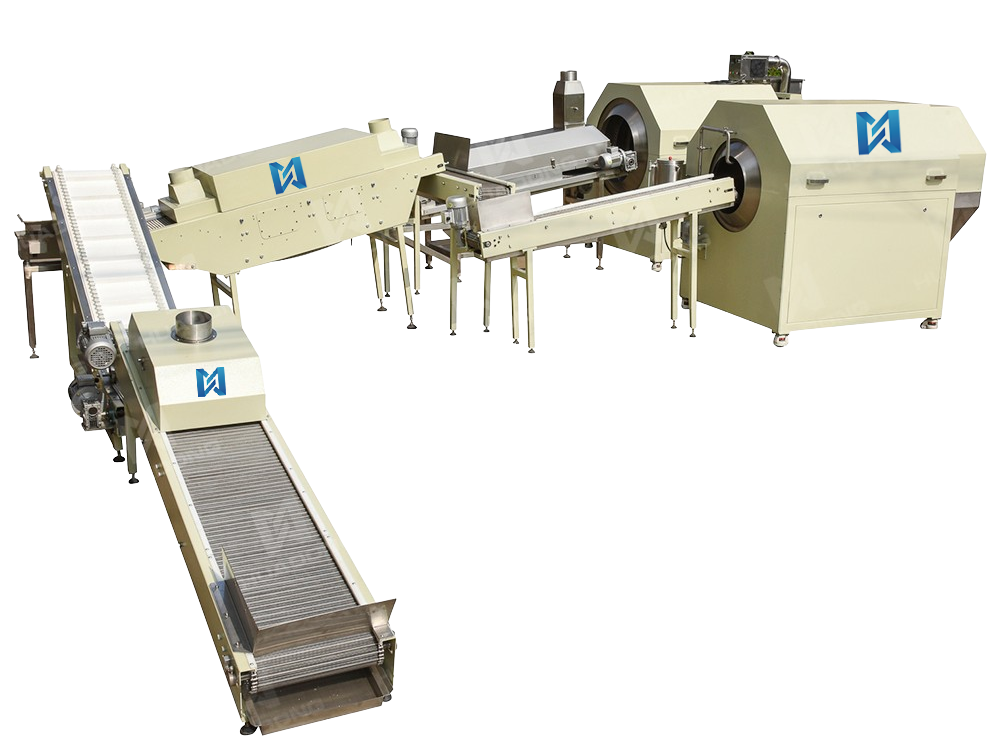 整理系统由脱模输送机、提升输送机、淀粉清洁器、传送输送机、输油机、油涂布机、蒸汽加湿器和糖砂光机组成。